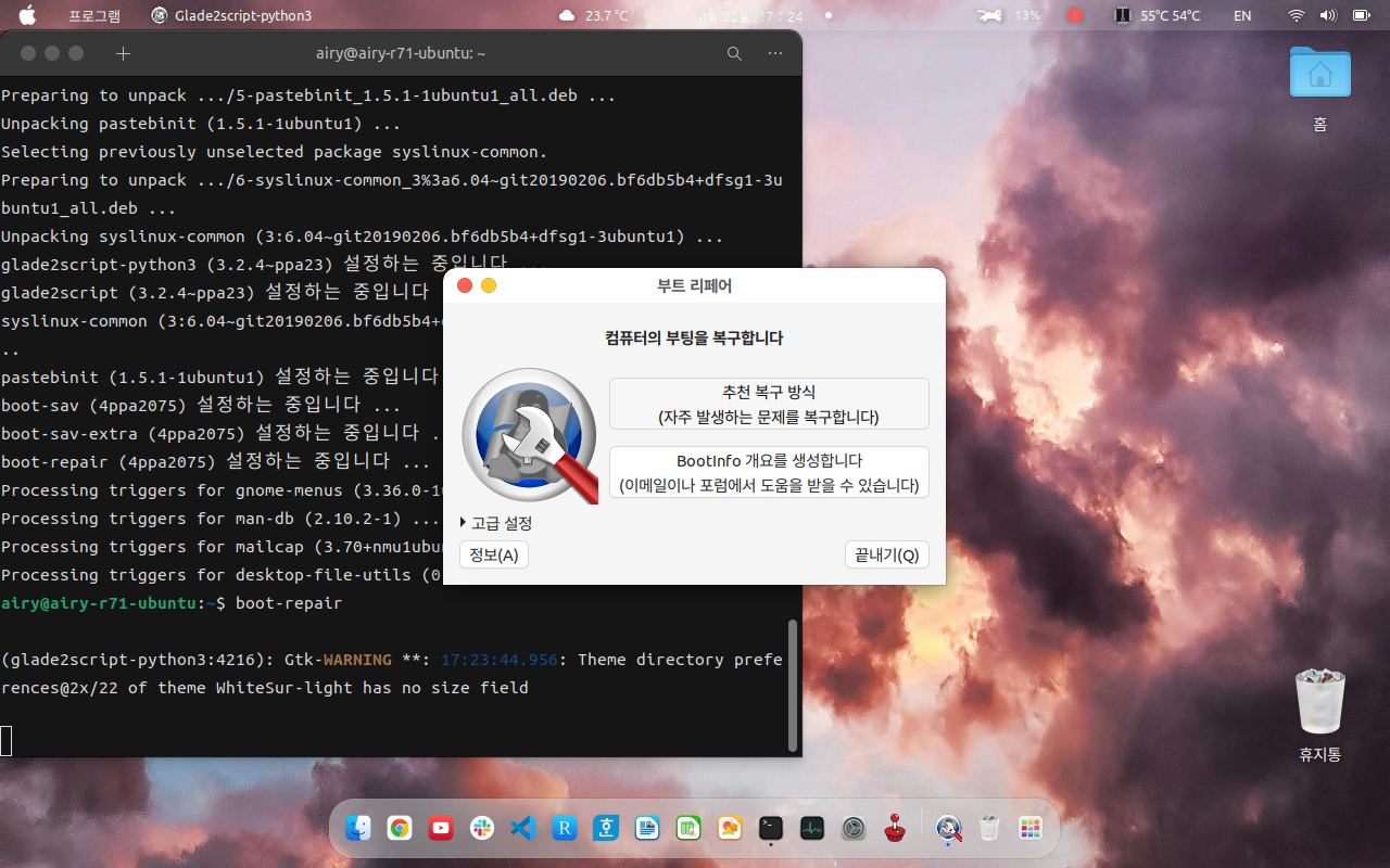 ubuntu(우분투) boot repair : 윈도우 우분투 멀티 부팅시 우분투만 바로실행 grub 실행안됨 (usb 필요없음) 우분투와 윈도우 멀티 부팅시 OS선택 화면이 뜨지 않고 바로 우분투만 실행 될때 쓰는 방법입니다.보통 검색하면 우분투 부팅USB가 필요하다고 나오는데, 이경우는 우분투가 정상실행안될때 이고정상 실행된다면 우분투 내 터미널에서 boot-repair를 시도해 볼수 있습니다.1. boot-repair 설치sudo add-apt-repository ppa:yannubuntu/boot-repairsudo apt-get updatesudo apt-get install -y boot-repair2.실행boot-repair 3.아래와 같이 뜨면 상단 메뉴 선택 [추천 복구 방식] OS & Hardware/Linux_ubuntu 2024.04.22