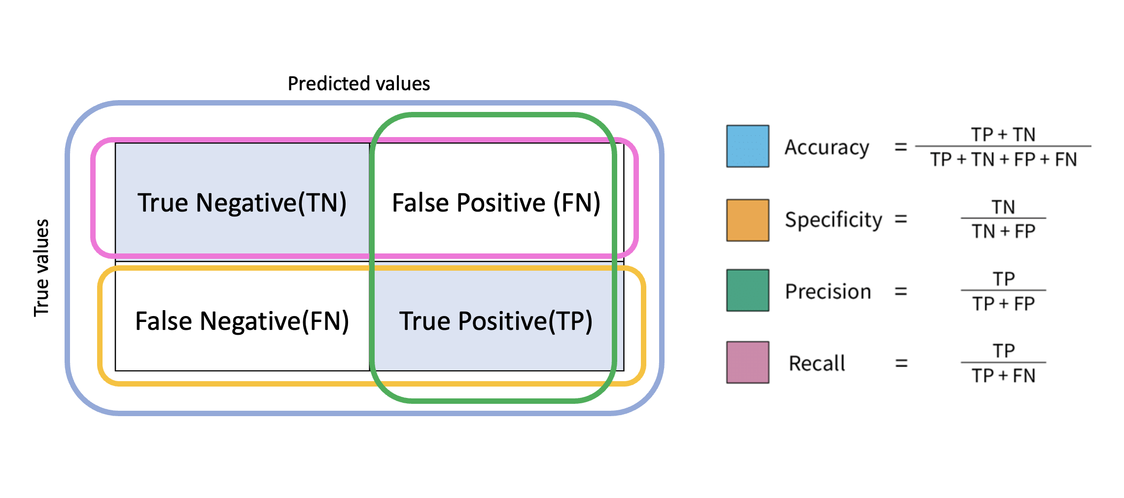 [ML] Model evaluation metrics Accuracy(정확도) - 예측을 정확하게 한 정도 Error Rate(오류도) - 예측을 실패한 정도 Sensitivity (민감도)(Recall for negative class) == Recall(재현율) - 실제 P중에 예측으로 맞춘 정도 Specificity (특이도)(Recall for positive class) - 실제 N중에 예측으로 맞춘 정도 pecision(정밀도) - P로 예측한것 중에 맞준정도 fall-out(위양성율) - P로 예측한것 중에 틀린정도 F1 score - 보통 불균형한 데이터 분포에서의 분류문제에 평가척도로 사용. -F1은 정밀도와 재현도를 이용해 조화평균을 구하여 평가 척도를 구성했기 때문에, 불균형 데이터일지라도 값의 크기 차이가 어느정도 상쇄되므로 데이터 분.. Data Science/Machine Running 2023.07.19
