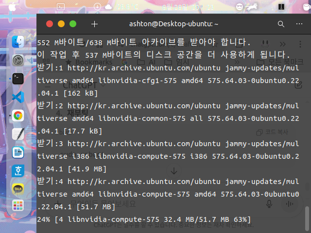 그래픽카드가 엔비디아라면엔비디아 대신 기본드라이버(nouveau) 로 부팅되면서 제대로 동작하지 않는 상황입니다.nouveau 드라이버 블랙리스트 추가sudo nano /etc/modprobe.d/blacklist-nouveau.conf아래 내용을 추가하고 저장blacklist nouveauoptions nouveau modeset=0권장 드라이버 확인 sudo update-initramfs -u권장 드라이버 설치ubuntu-drivers devices여기서 보통 nvidia-driver-575 같은 게 "recommended"로 표시됩니다.sudo ubuntu-drivers autoinstall->만약 특정 버전 직접 설치하고 싶으면: sudo apt install nvidia-driver-575 처럼..
